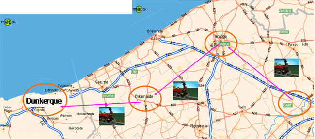 Le 17/05/1940 : Et finalement, en passant par Bruges et Dixmude, nous traversons la frontière à 14 h 30 et arrivons à Dunkerque vers 17 h 30, de là, nous partons pour Boulogne, arrivée à 1 h 30 du matin. Le train de Gérard Dubuisson, partait après le nôtre, il a été bombardé et immobilisé à Dunkerque.
