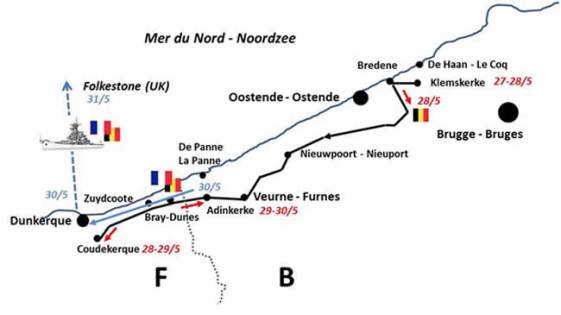 L’opération Dynamo est commencée depuis le 26 mai. Elle doit aboutir à l’évacuation la plus complète possible des forces alliées par voie maritime vers l’Angleterre. A la nuit tombante, le 30 mai, le détachement belge est embarqué sur le « St-Helier ». Ce navire aura l’honneur d’être le bateau qui embarquera, le 3 juin, les derniers hommes du corps expéditionnaire britannique. Après cette date, l’opération dynamo sera prolongée pour continuer l’évacuation de soldats français. C’est le 4 juin 1940 à 3 h 40, que le tout dernier navire, le « Shikari », quitta Dunkerque. Au total, 338 000 soldats alliés purent être évacués.