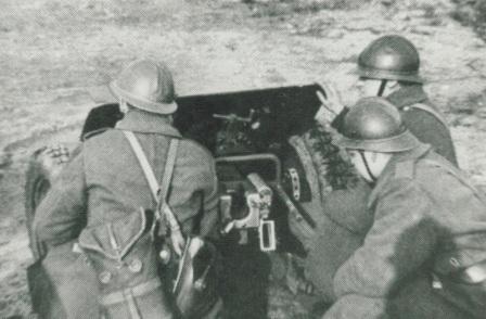 Le lieutenant a reçu des instructions. Après un court déplacement, nous nous déployons en tirailleurs dans une prairie, à droite d'un chemin de terre. On nous a adjoint un canon de 4,7 tracté par une chenillette. Le conducteur est seul et n'a plus d'obus!