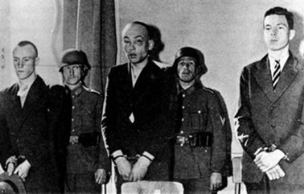 Trois membres de la résistance, les partisans Fraiteur, Raskin et Bertulot, durant leur procès par la justice allemande.