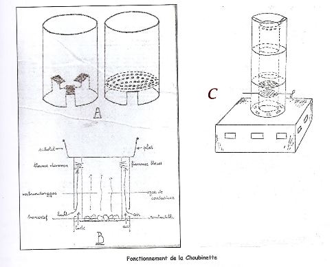 Qu’on essaye un peu de mettre le feu à un tas de sciure ! Sans sourciller, nous achetâmes la sciure et un modèle spécial de "choubinette" la consomma sans sourciller davantage ! Je ne sais plus en quoi consistaient les modifications au modèle ordinaire. Mais je me rappelle bien que, pour charger l’appareil, il convenait d’utiliser deux barreaux de chaise; un tenu verticalement au milieu de la boite pour ménager dans la sciure une cheminée centrale, et l’autre placé à angle droit du premier, horizontalement et en bas pour l’ouverture de la cheminée.
