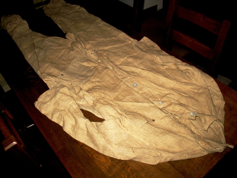Ne connaissant pas grand chose du sujet, je peux simplement dire que les manches étaient revêtues d'insignes confectionnés semble t'il a partir d'un "chevron anglais" coupé en deux. Elle semble conforme à la description ((fabrication artisanale en toile de jute). Cet objet est-il rare et susceptible d'intéresser un collectionneur?